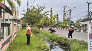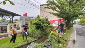 Selain di lingkungan pemukimam dan tepi jalan raya, dilanjutkan membersihkan lingkungan kantor dan mengangkat sampah serta gulma yang ada di selokan depan kantor kelurahan.